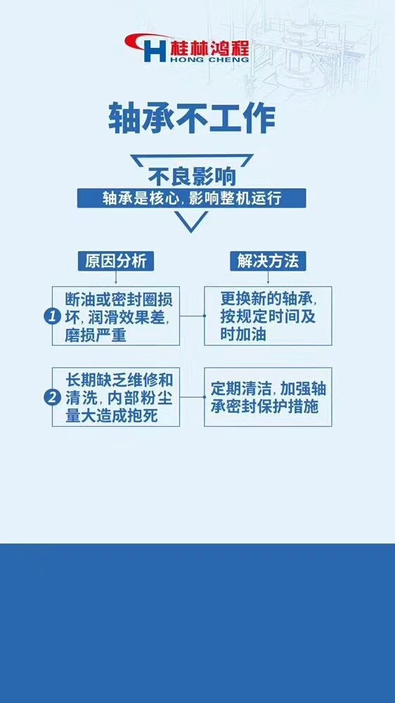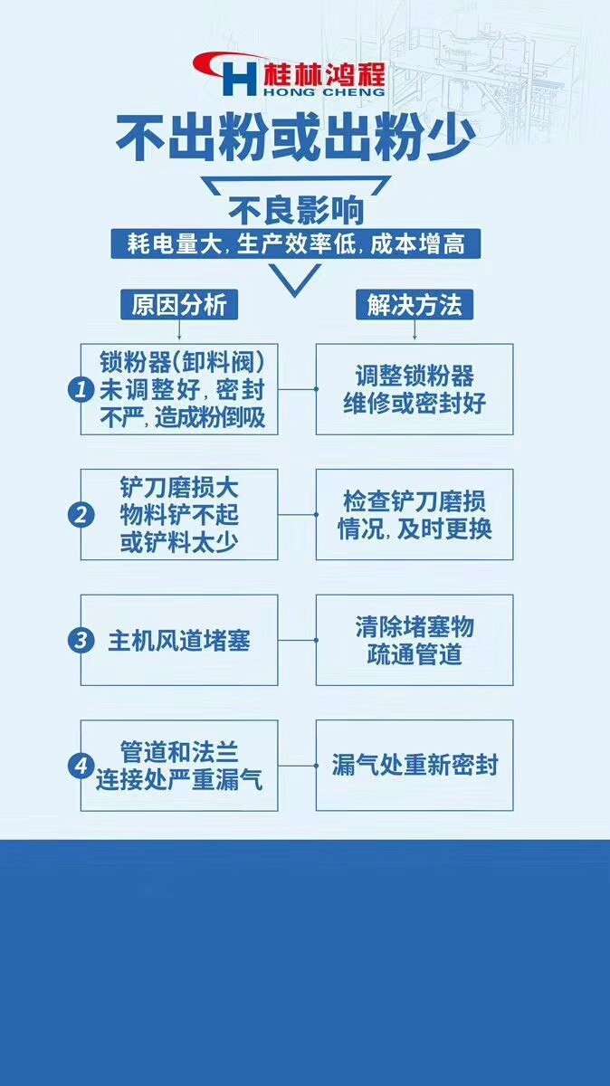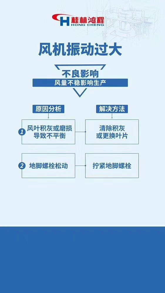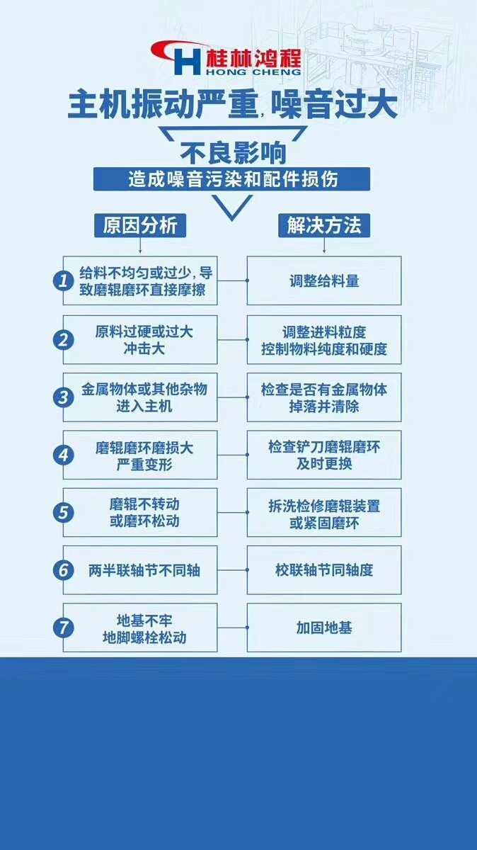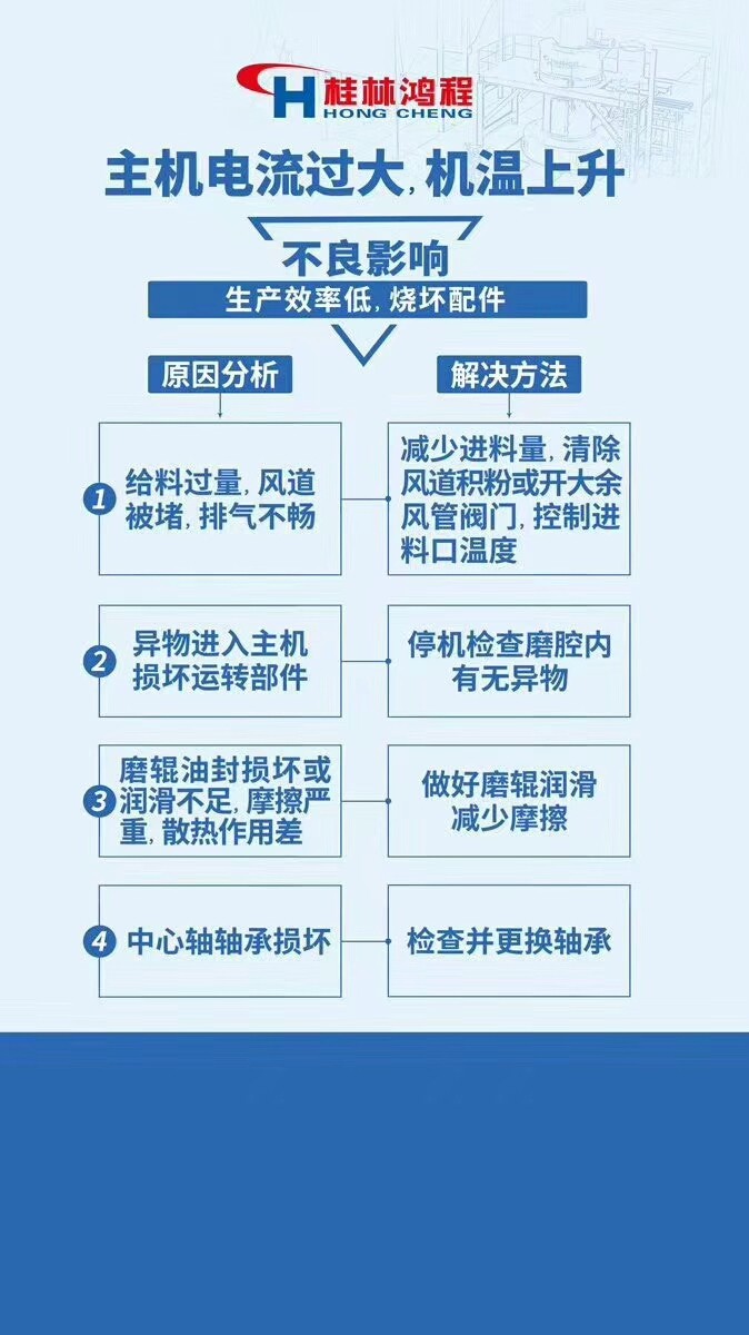 1.風(fēng)機(jī)振動(dòng)過大 2.石灰磨粉機(jī)不出粉或者出粉少 3.傳動(dòng)裝置和風(fēng)機(jī)油條發(fā)熱 4.石灰磨粉機(jī)主機(jī)振動(dòng)或者噪音過大 5.石灰磨粉機(jī)軸承不工作 6.石灰磨粉機(jī)主機(jī)電流過大,機(jī)溫上升。